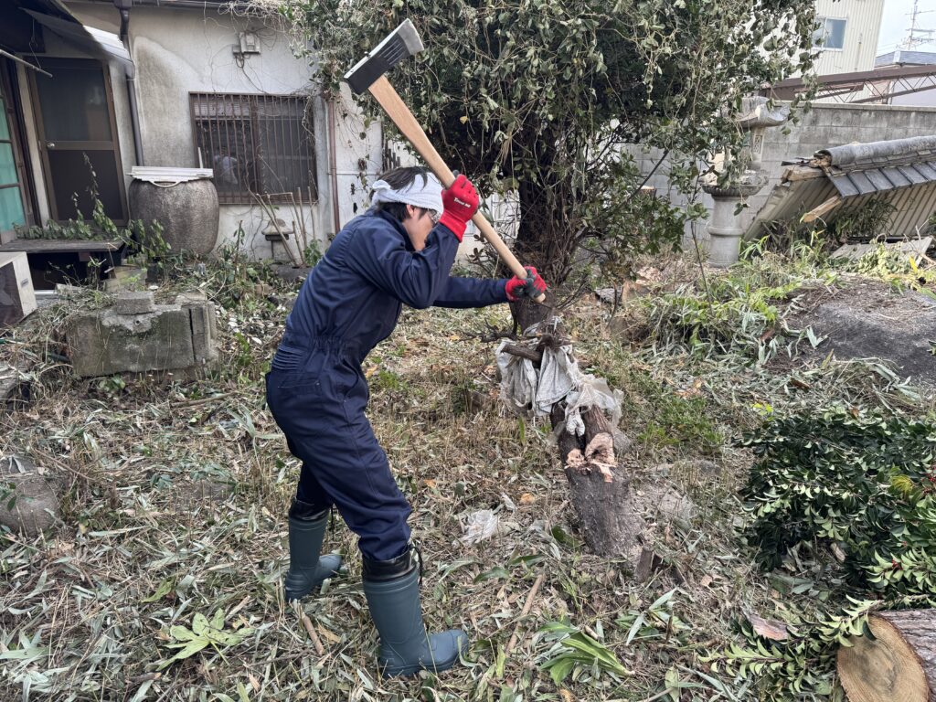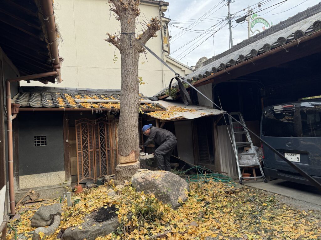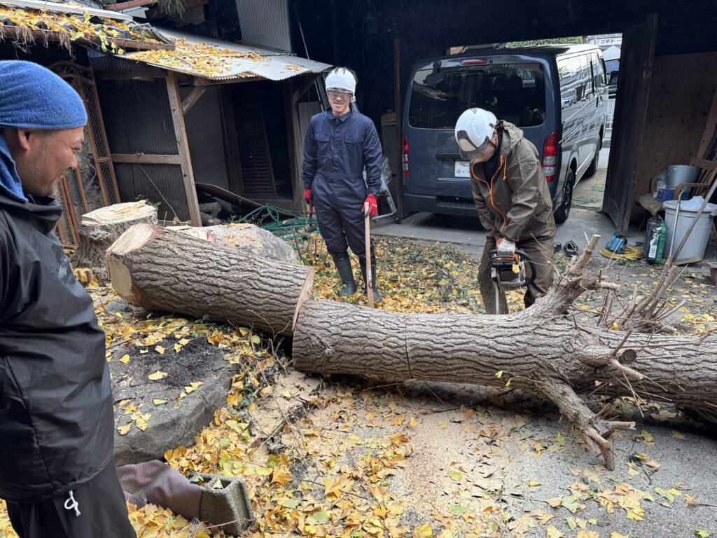 古民家の庭に立派に育った大木。今回は仲間と協力しながら、チェーンソーを使って伐採作業です。一番大事な工程が、「倒す方向をしっかり考えること」。これを間違えると、建物や周囲に大きな被害が出てしまいます。声を掛け合いながら、慎重に、少しずつ切り進めていきました。