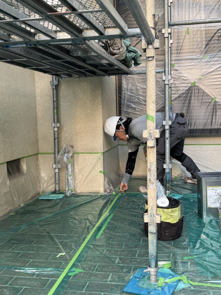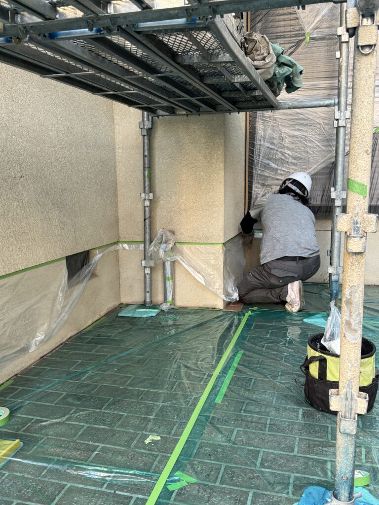 今回は、外壁塗装前の養生作業の様子をご紹介します!