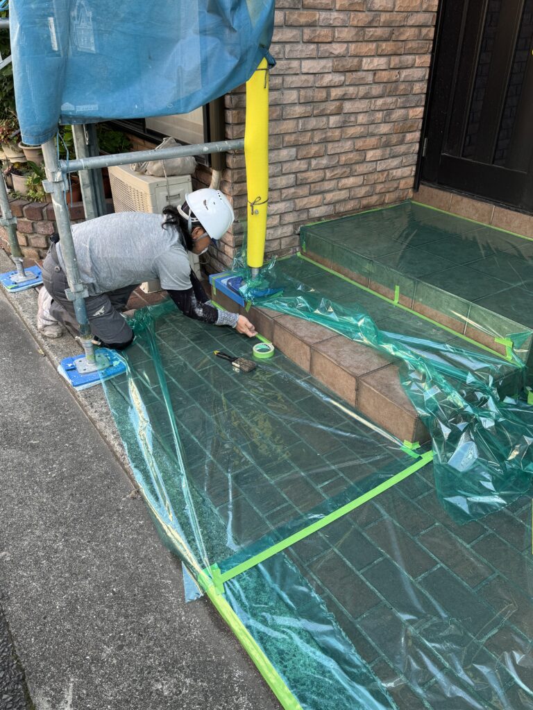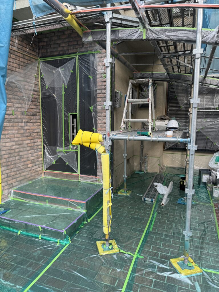 2階から順番に養生作業を終えて、現在は玄関まわりの養生作業の様子です!