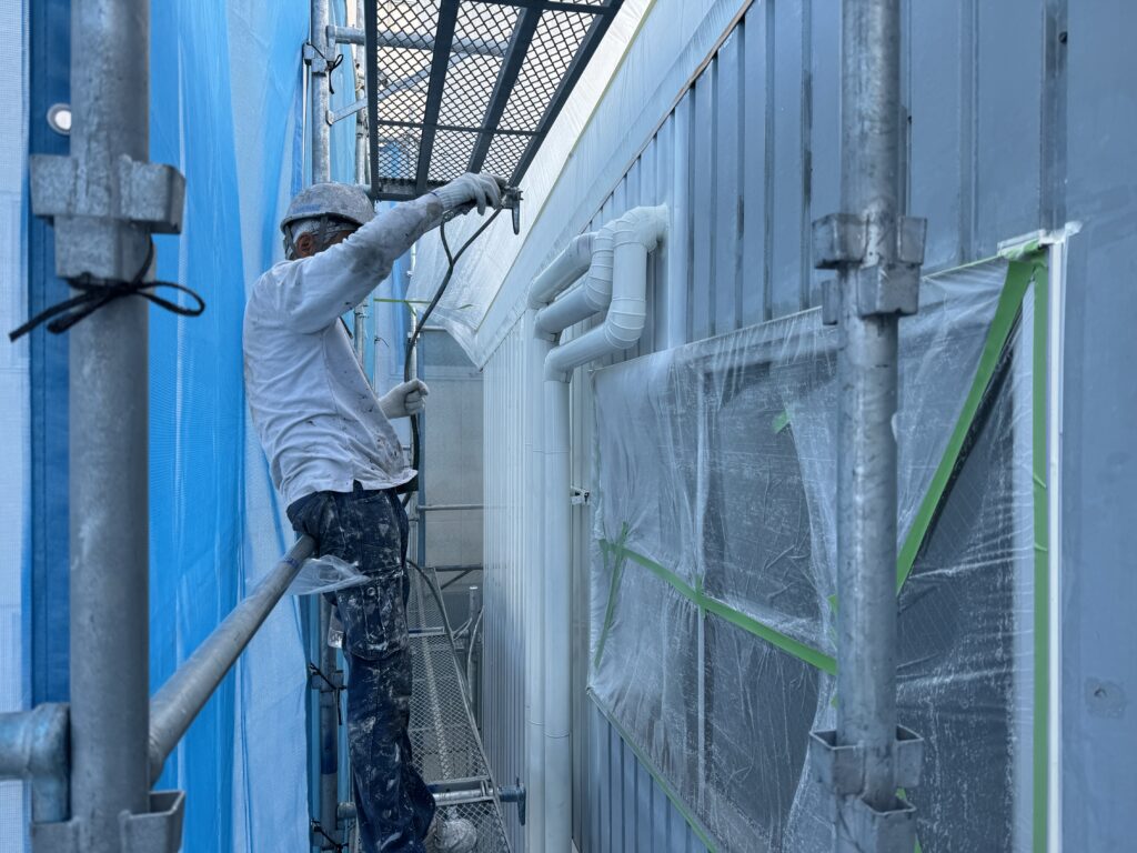 今回の外壁は角波鋼板のため、溝(凹凸)が多く、刷毛やローラーでは塗り残しが出やすい素材です。そのため、今回は吹付作業で均一に塗布しています。